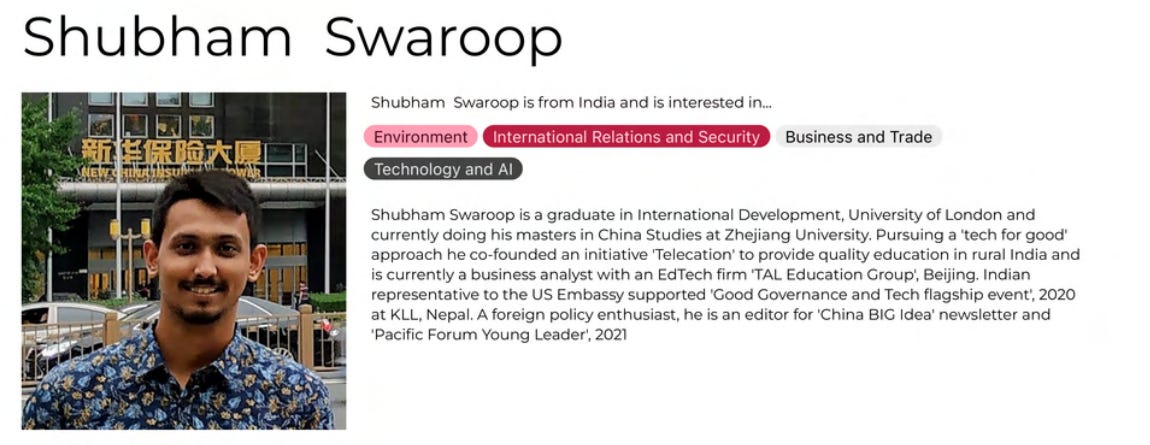 Editor China BIG Idea Weekly, Zhejiang University scholar, MA China Studies, Hangzhou, China. International Development graduate, University of London. Pacific Forum Young Leader, Honolulu, USA. Twitter @swrp_shubham