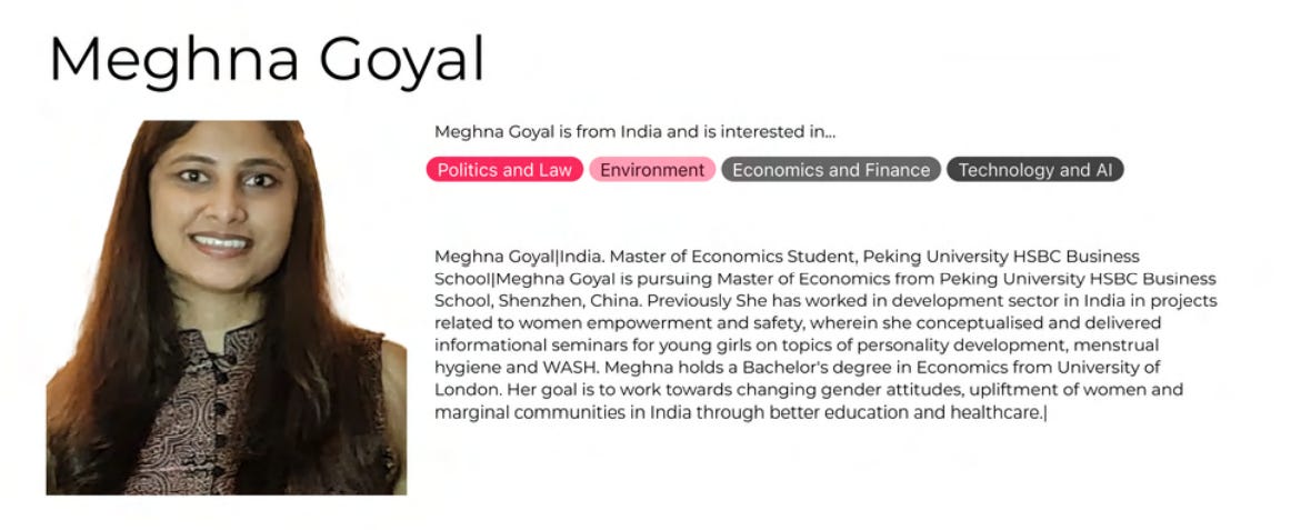 Meghna Goyal a full-time student of Master of Economics at Peking University. She’s an Economics graduate from University of London and her goal is to work towards changing gender attitudes, upliftment of women and marginal communities in India.